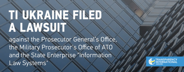The Chapter of the international anti-corruption organization Transparency International Ukraine filed a lawsuit in Kyiv Regional Administrative Court against the Prosecutor General’s Office of Ukraine, … Continue reading TI Ukraine Filed a Lawsuit against the Prosecutor General’s Office, the Military Prosecutor’s Office of ATO Forces and the State Enterprise “Information Court Systems”