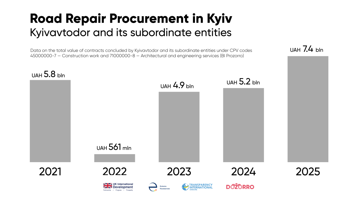 After a sharp decline in the first year of the full-scale war, road repair volumes in Kyiv gradually recovered. In 2021, UAH 5.8 billion was allocated for repairs and only UAH 561 million in 2022. In 2023, the city returned to larger-scale works, contracting nearly UAH 4.9 billion, and in 2024 — UAH 5.2 billion.