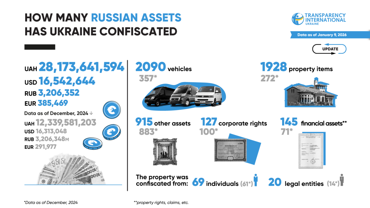 TI Ukraine closely monitors the entire process of confiscating Russian assets and compiles relevant data. Below is a summary, with the full dataset in a table available for download.