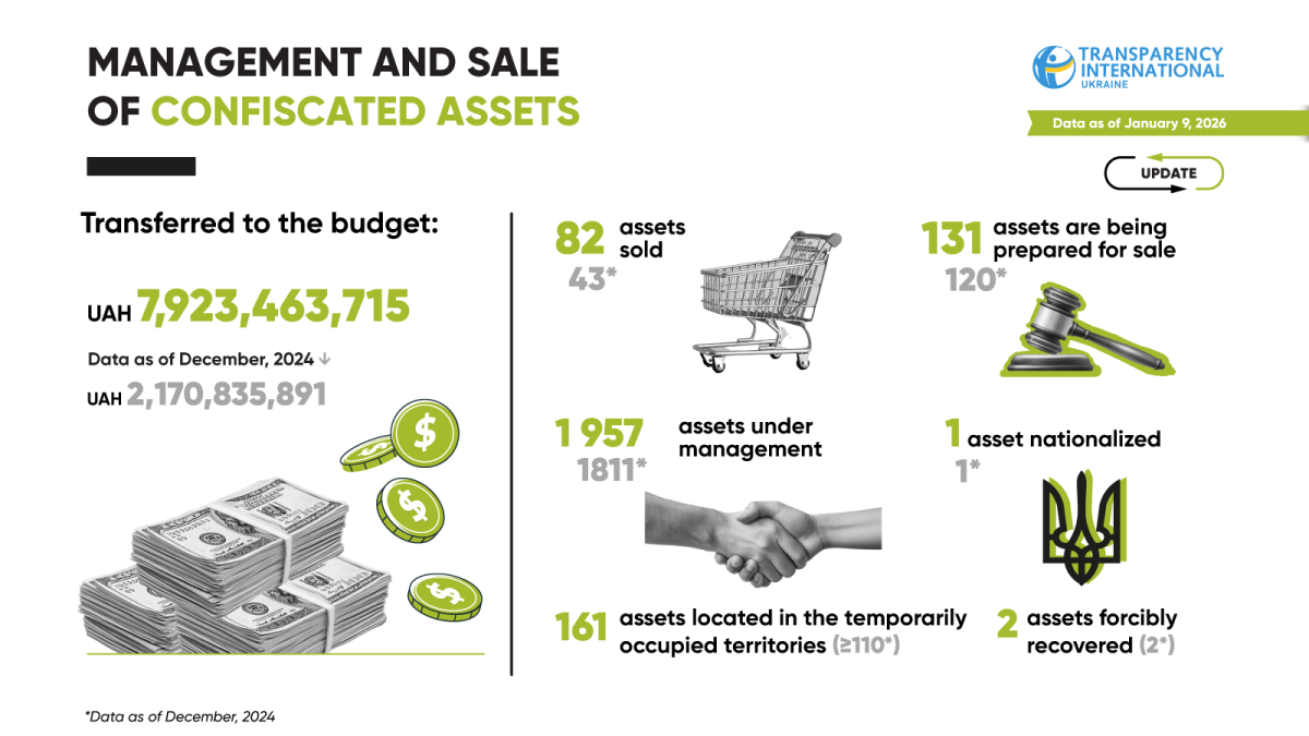 When it comes to asset sales, the statistics are disappointing: 70% of all assets recovered for the national budget cannot be sold due to legislative restrictions, delays in decision-making, their location in temporarily occupied territories, or their allocation to defense needs.
