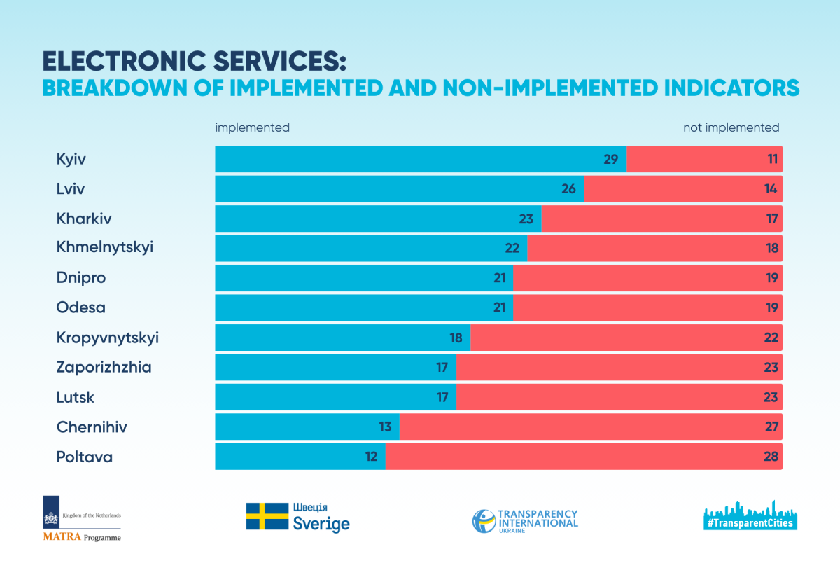The 11 analyzed cities demonstrate very different levels of development of electronic services ecosystems. While the range of openness assessment results for this sample was 28 points, the gap between the highest and lowest scores in the second block amounted to 43 points. This disparity can be explained by the fact that, unlike indicators related to electronic services, many openness indicators are direct requirements of Ukrainian legislation, which city councils cannot ignore.