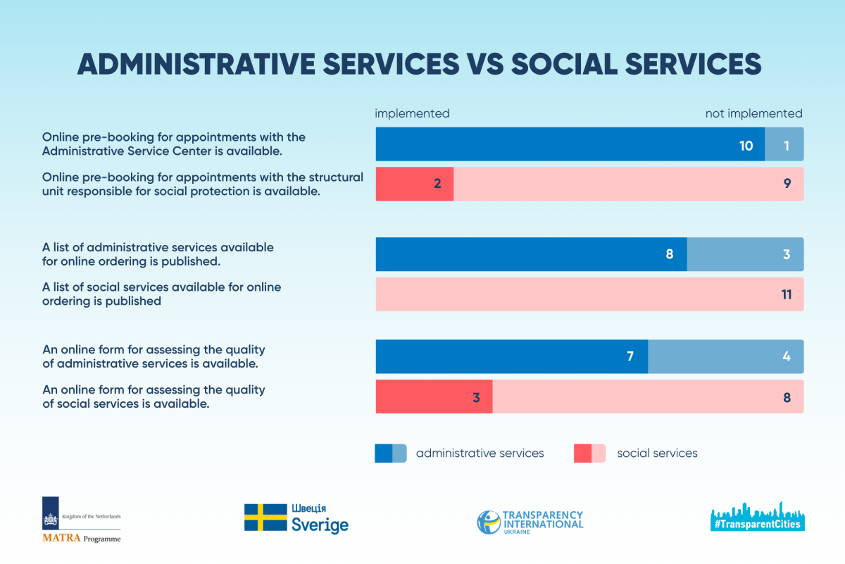 The analysis of indicators related to administrative and social services was based on the provisions of the Laws of Ukraine on Administrative Services and on Social Services, as well as the Order of the Ministry of Social Policy of Ukraine on Approval of the Classifier of Social Services. These indicators did not place emphasis on distinguishing between state and municipal services.