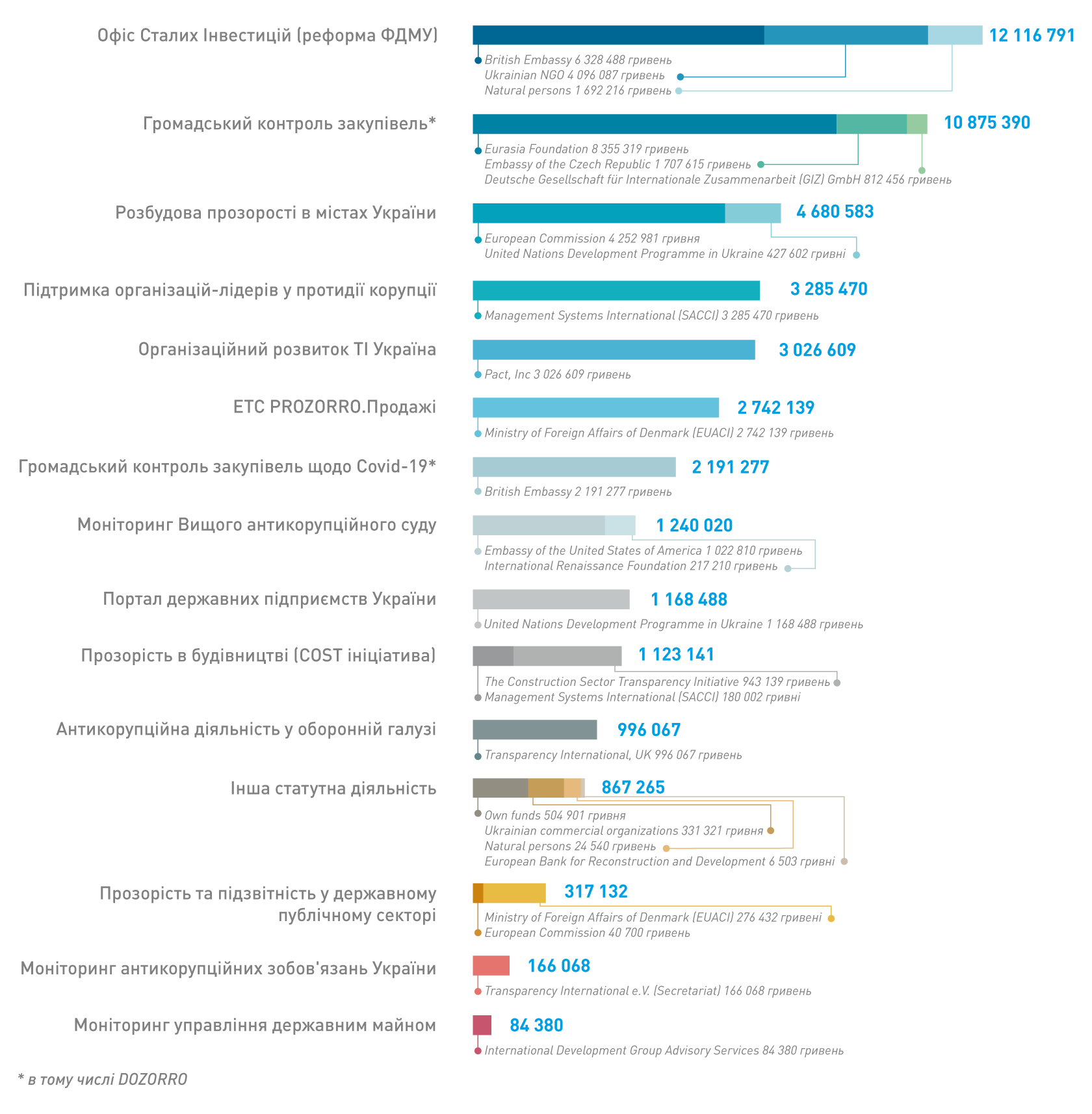 - Підтримали мережу регіональних громадських організацій — DOZORRO спільноту. За 2020 рік спільнота скерувала понад 9 тисяч листів до замовників, контролюючих чи правоохоронних органів за результатами аналізу закупівель.