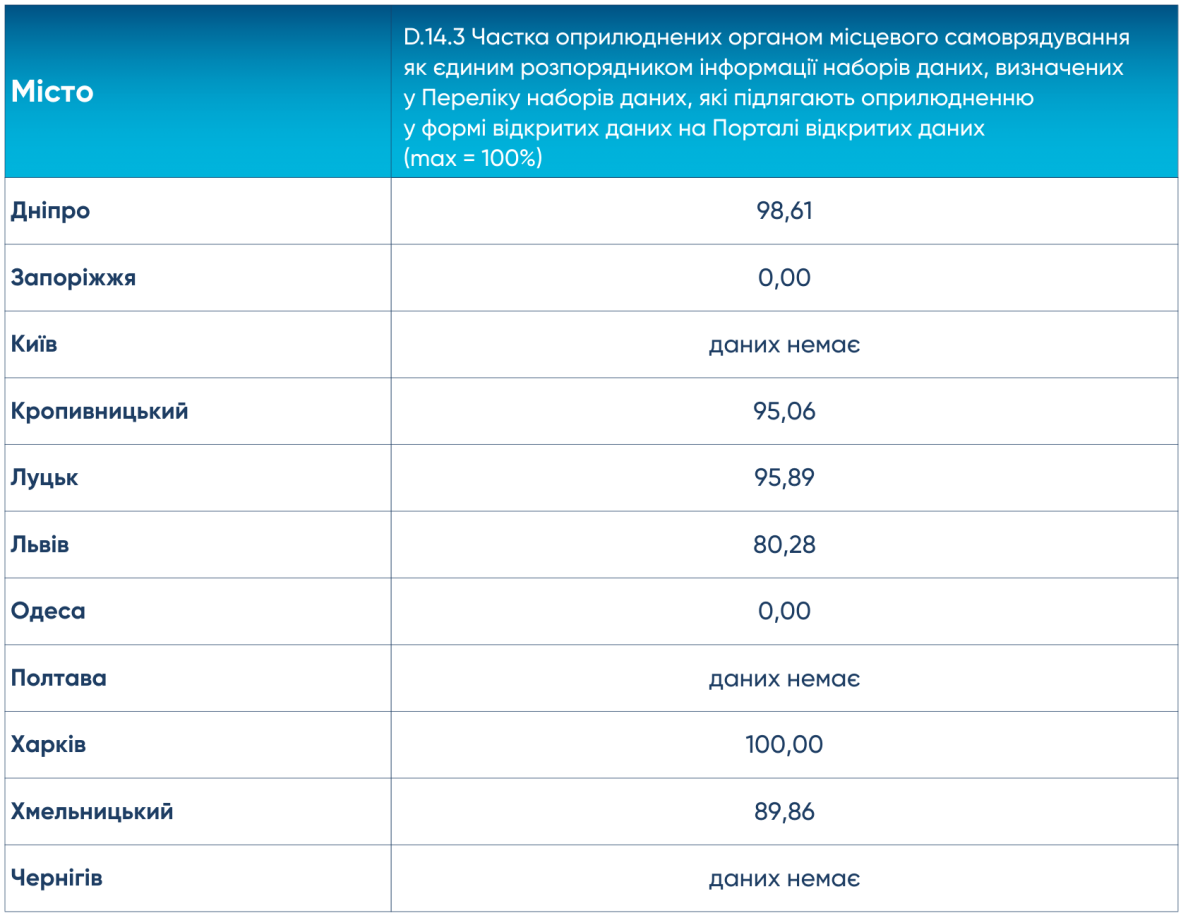 Що стосується міст, які опинились в рейтингу одразу позаду Києва, то Луцьк, Львів і Дніпро випередили столицю за результатами оцінки блока індикаторів, пов’язаних з політикою відкритих даних. Критичним для них, а також для Кропивницького стало те, що Мінцифри не налагодило щомісячне автоматичне перенесення даних з місцевих порталів відкритих даних на державний портал.