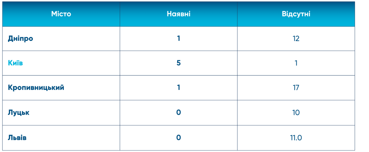 Найвищий результат у Києва – 44,3 зі 100 можливих балів. Позицією нижче – Луцьк із 40 балами, далі – Кропивницький і Львів, які отримали по 35,3 балів.