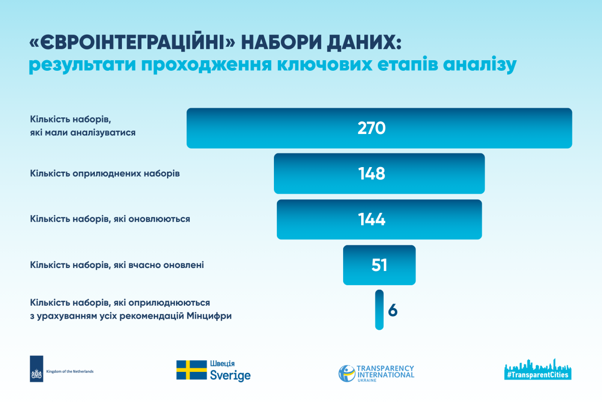 Із 270 «євроінтеграційних» наборів, які аналітики шукали в 9 електронних кабінетах, станом на 5 грудня 2025 року були оприлюднені 148 (55%). Із них лише 51 набір мав вчасно оновлені ресурси. Цей результат значною мірою зумовлений тим, що Дніпровська, Кропивницька, Луцька, Львівська міські ради – лідери за кількістю оприлюднених наборів – користуються власними порталами відкритих даних, а Мінцифри не може забезпечити регулярне щомісячне перенесення даних з цих порталів на data.gov.ua.